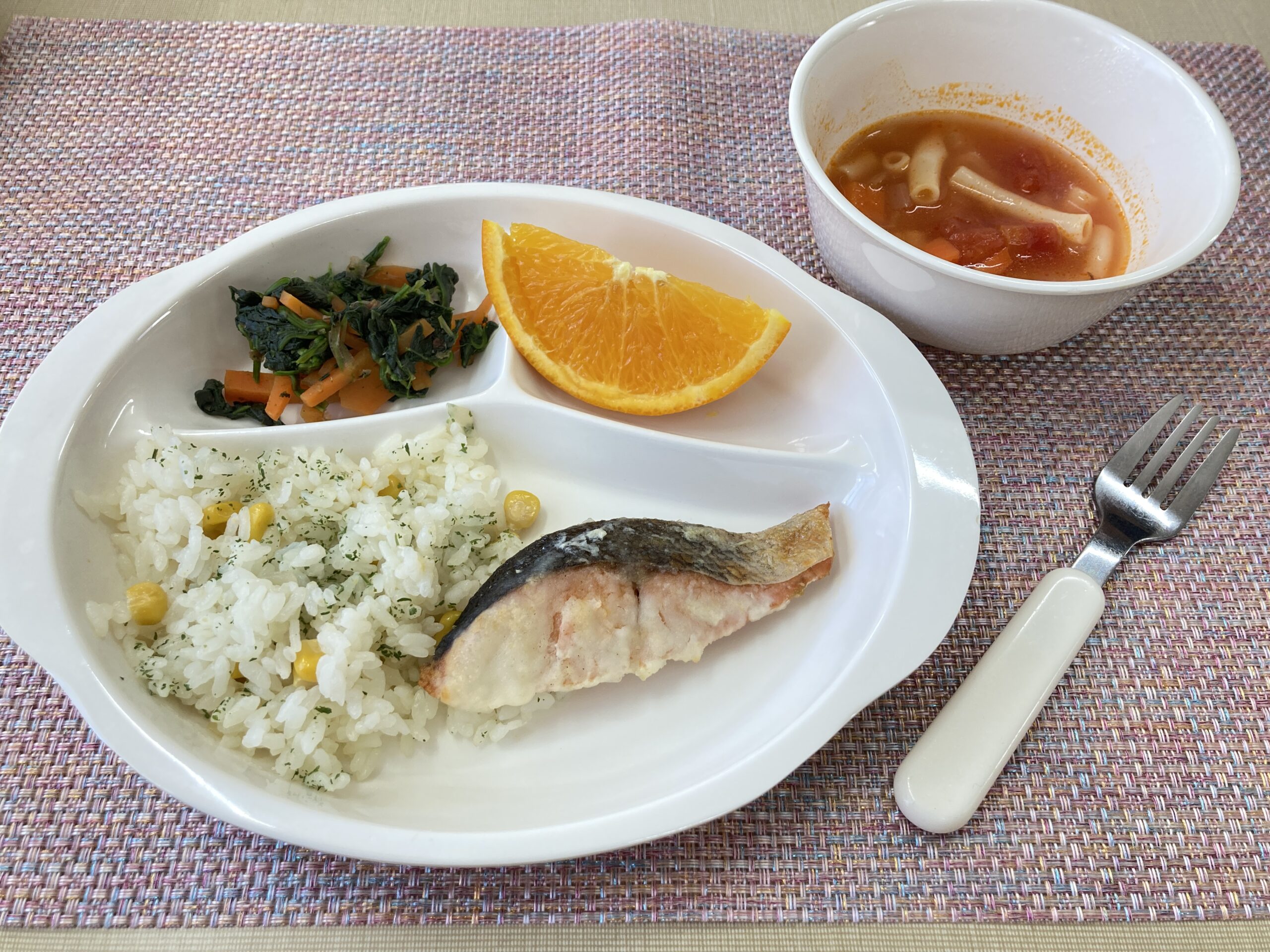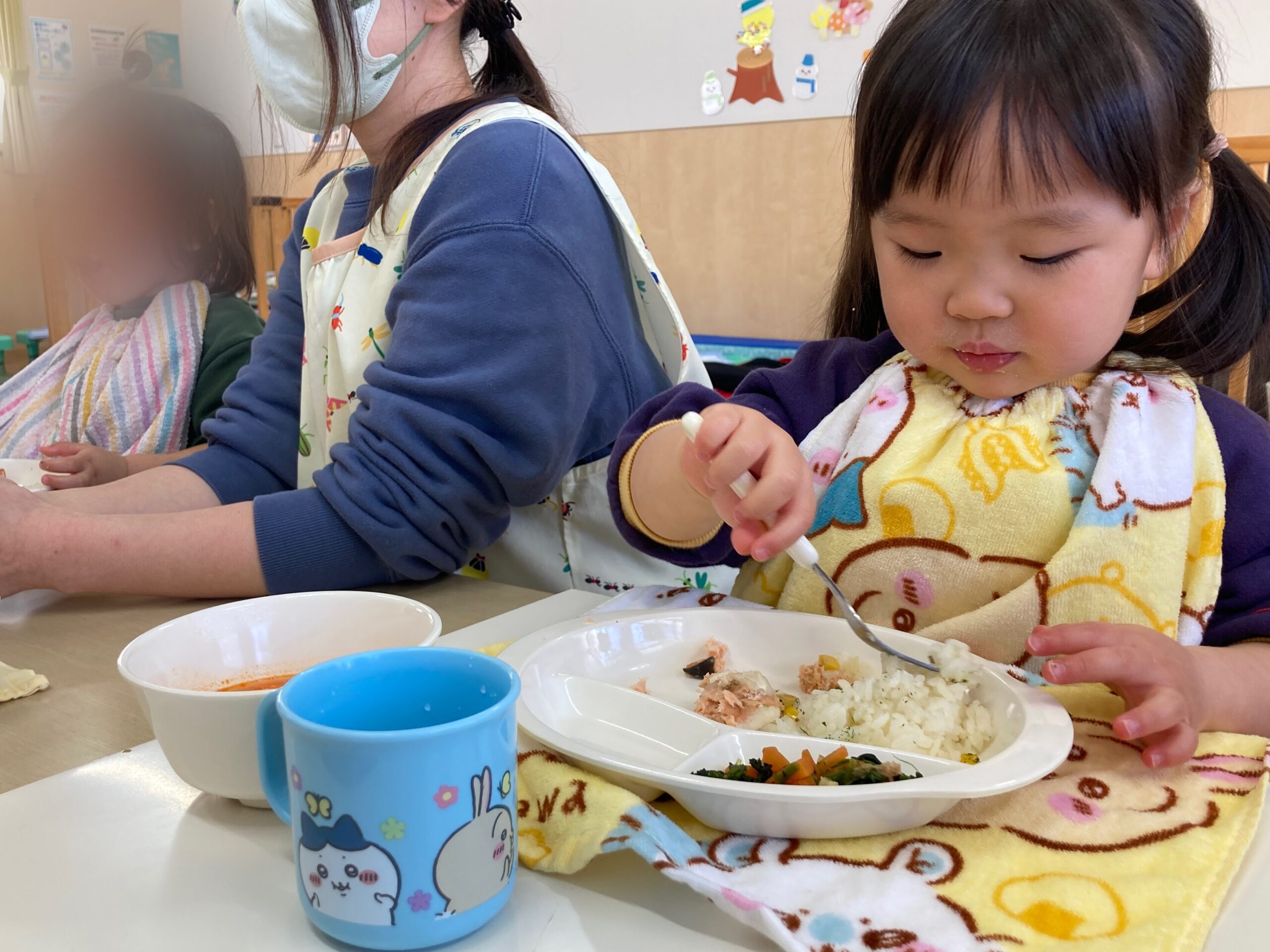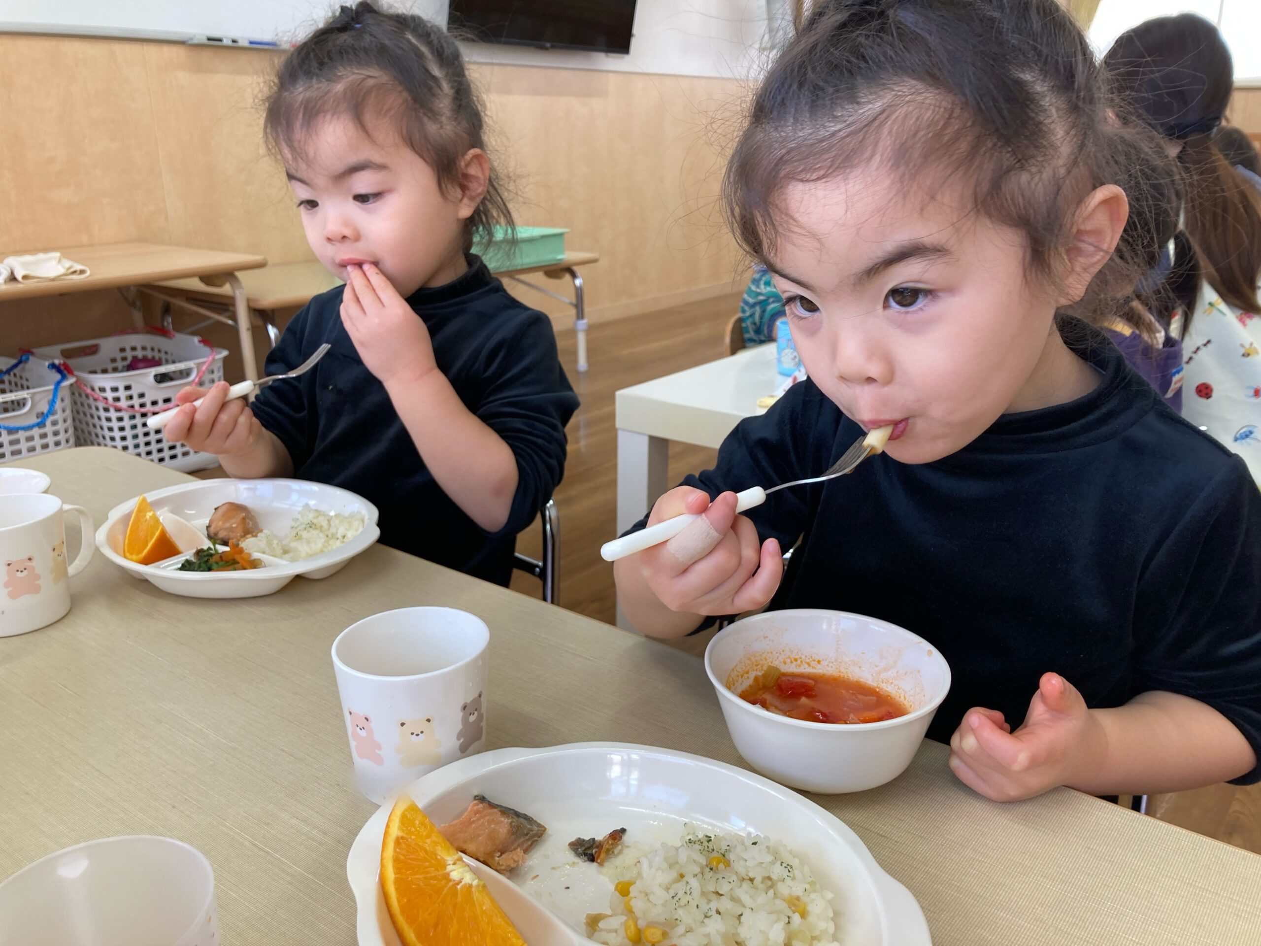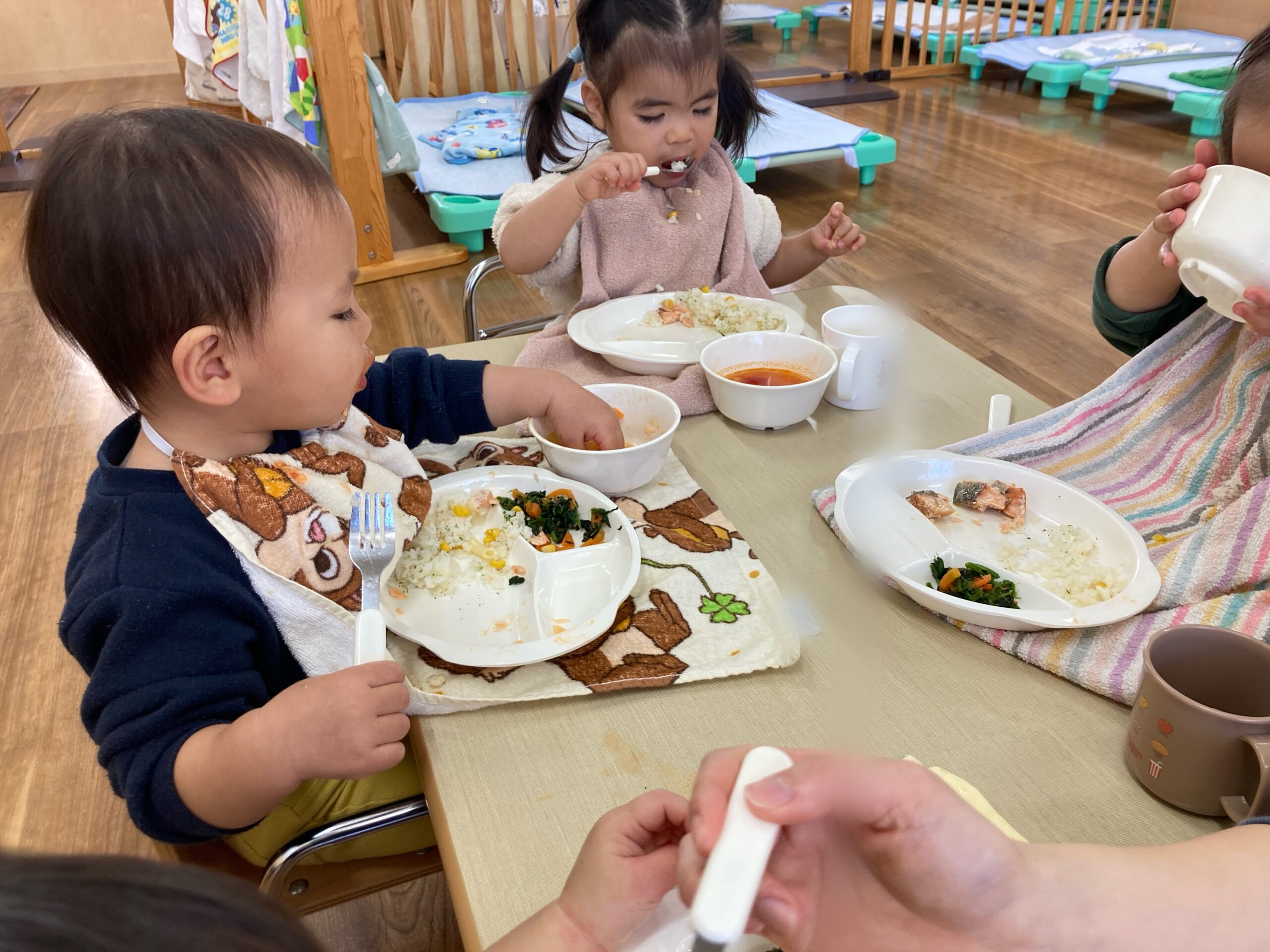 2歳児さんはフォークを三点持ちで握り、上手に食べられています✨